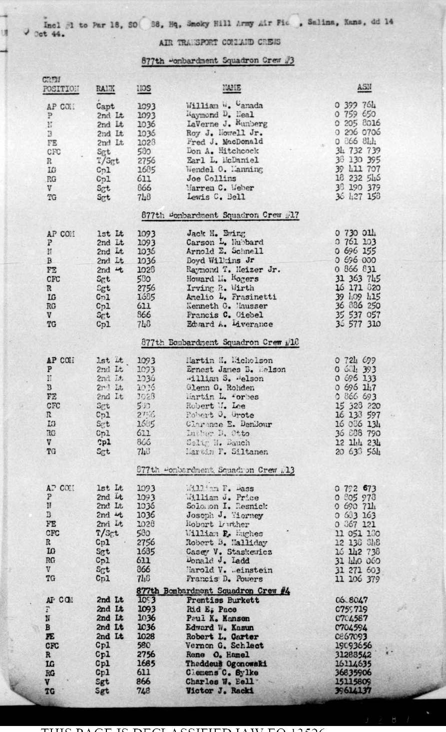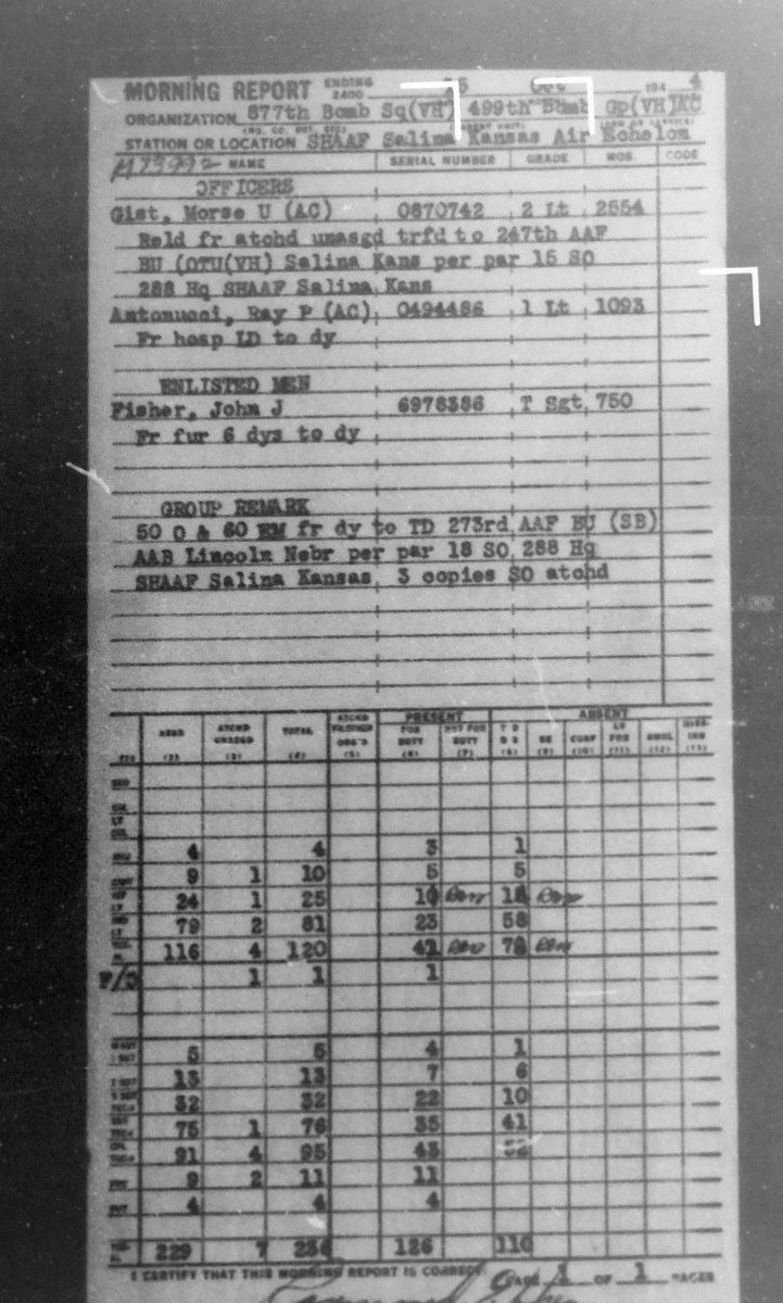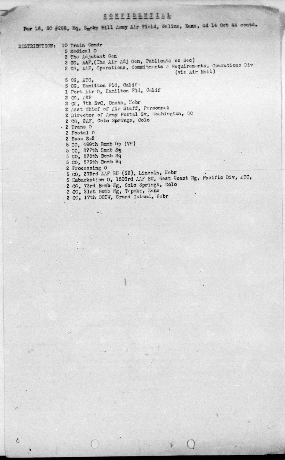 The first four documents are from AFHRA REEL B0655 and the two Morning Reports are from Roy Wall. There are details in the first page that I would like to bring to your attention. The first is Special Orders (SO) Number 288 dated 14 October 1944 originating from HQ SHAAF, Salina, Kansas. In the first sentence are the words 'Air and Flight Echelons '. The Flight Echelon will pick up their B-29s most likely at Herington AAF, Kansas while the Air Echelon will travel to Lincoln AAF/AAB for final processing. These men will then travel by rail to Hamilton AAF ( near Novato, California ) to await their flight by C-54 to Saipan. Below this long paragraph are three shipment numbers along with the date of their estimated arrival at the APOE ( Aerial Port of Embarkation, Hamilton Field). The 877th Bomb Squadron is in Shipment Number 9159-OI and is expected to arrive at the APOE on 1 Nov 1944. The next block of text has four lines and the 877th is listed first with the words 'Incl #1' followed by their Shipment Number. Within the second page is the Distribution List and from these many entries you can get an idea of where the 499th will be heading. Pages three and four have some details that I would like to point out. In the upper left corner is a long sentence that begins with: Incl #1 to Par 18 SO 288 This matches with the above sentence that has the 877th included in Incl #1 There are ten crews in these two pages. The first five are AIR TRANSPORT COMMAND CREWS and the second set in the fourth page are THEATER REPLACEMENT CREWS, with the Newell Crew being #20 The 877th Bomb Squadron Morning Report for 15 October 1944 states that 50 Officers and 60 Enlisted Men are released from duty at SHAAF and transferred for Temporary Duty with a unit at Lincoln. The clue that these are the correct men are the words ' per par 18 SO 288 Hq SHAAF '. I have not been able to locate documents stating what date these 10 crews departed Lincoln AAB nor when they arrived at the Aerial Port of Embarkation. Likewise, there are no documents for when they departed Hamilton Field for their flight(s) to Saipan. On the last page is the Morning Report, 877th Bomb Squadron for 19 December 1944 , Station SAIPAN M.I., noting that 5 Officers and 7 Enlisted Men have arrived from Temporary Duty (TD) for duty. The location where this TD took place is unknown. |